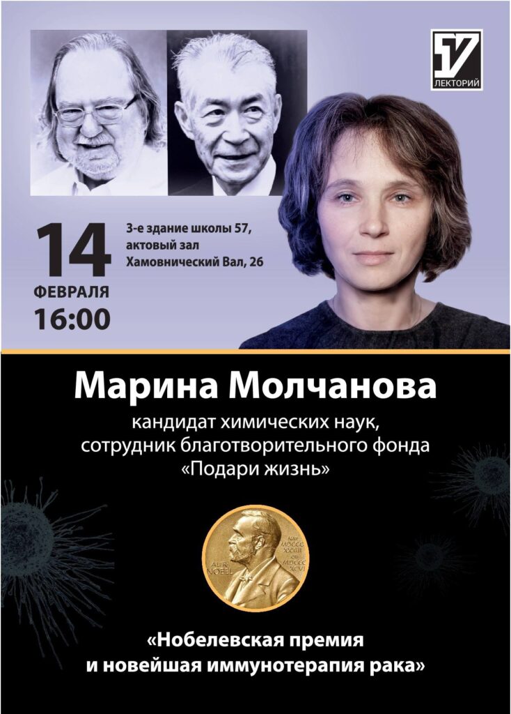 14 февраля в третьем здании школы (Хамовнический вал, 26) состоится лекция Марины Молчановой «Нобелевская премия и новейшая иммунотерапия рака».