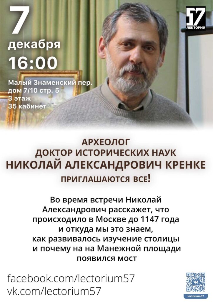 7 декабря в здании на Малом Знаменском состоится лекция Николая Александровича Кренке об археологии Москвы.